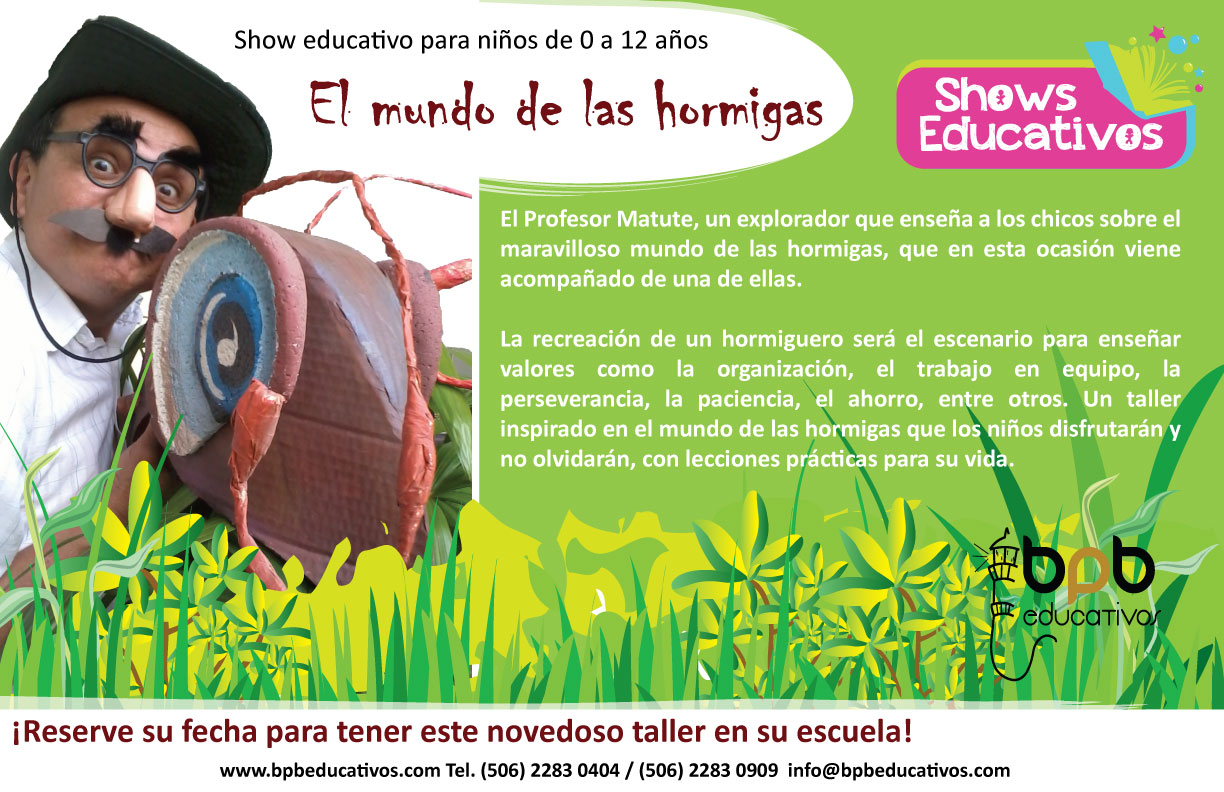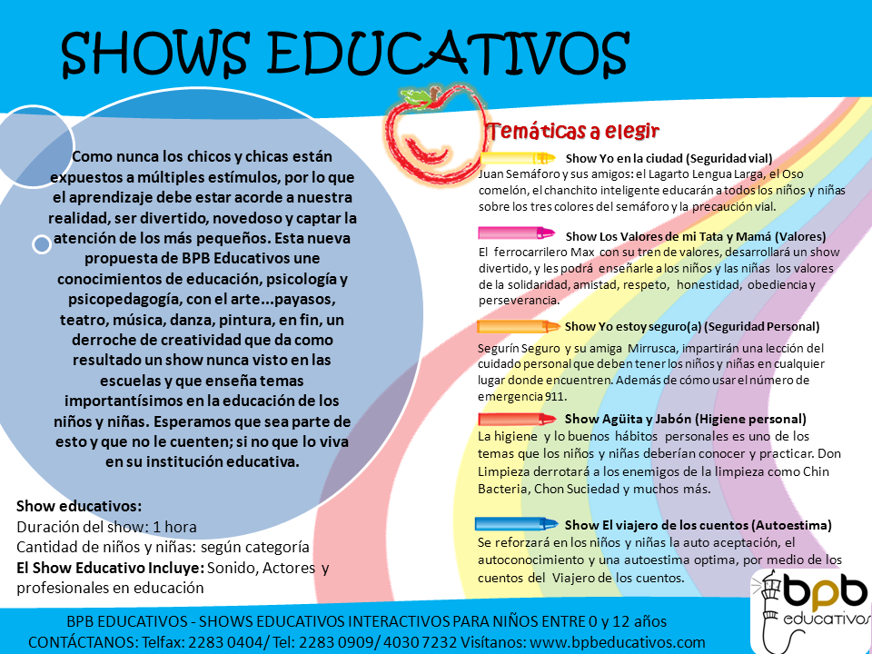 Los Shows Educativos para Niños(as) es una forma novedosa de llevar una lección completa e interactiva a su Institución o actividad infantil. Se imparte pedagógicamente adecuado para la edad de los participantes. Niños y Niñas desde preescolar hasta sexto grado.